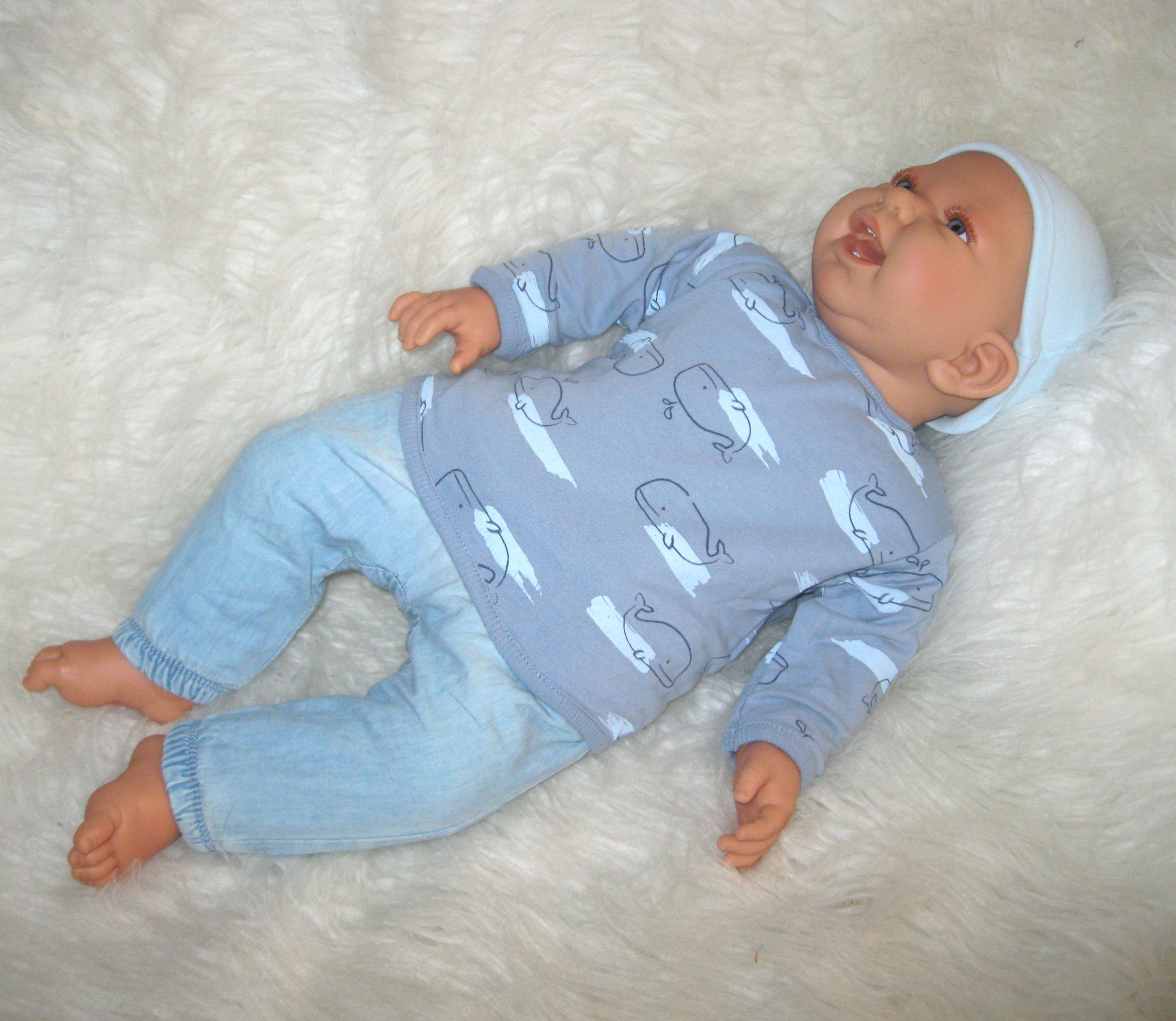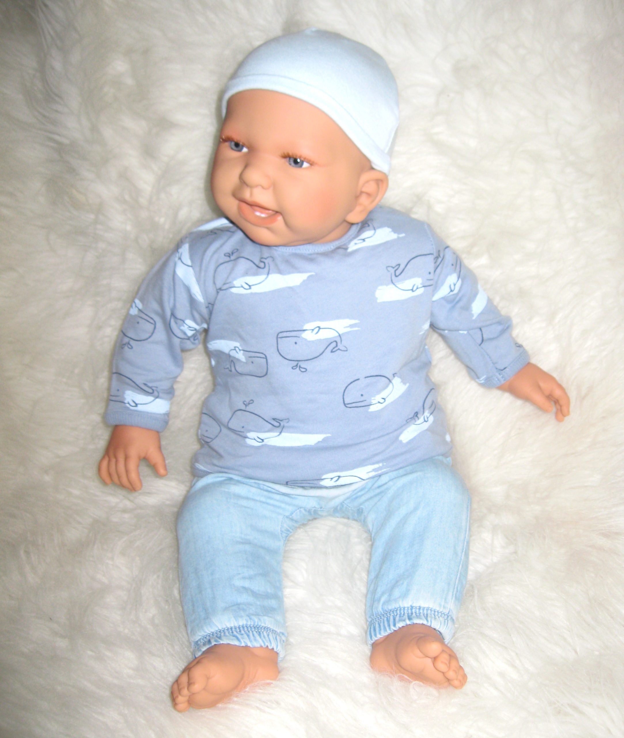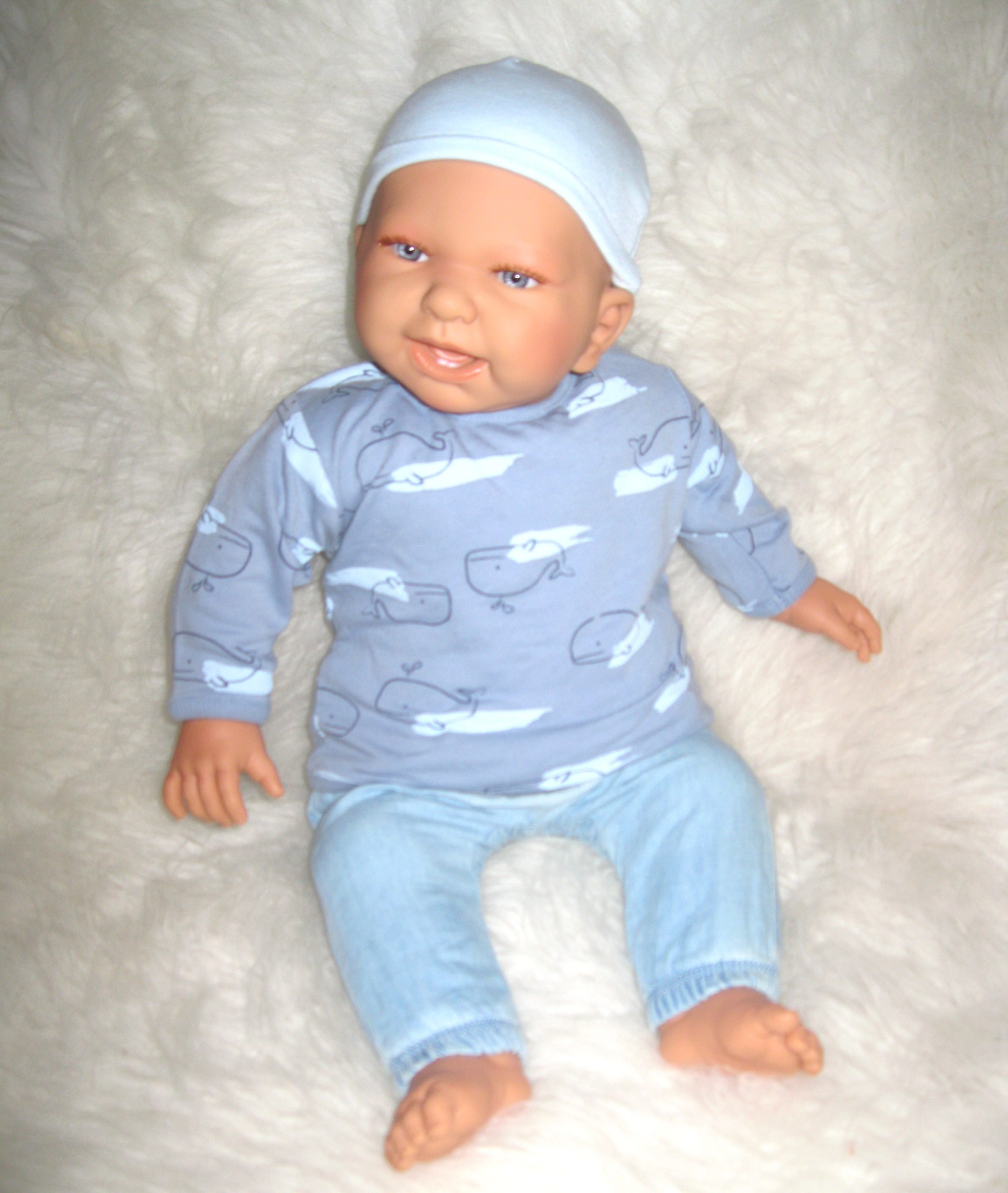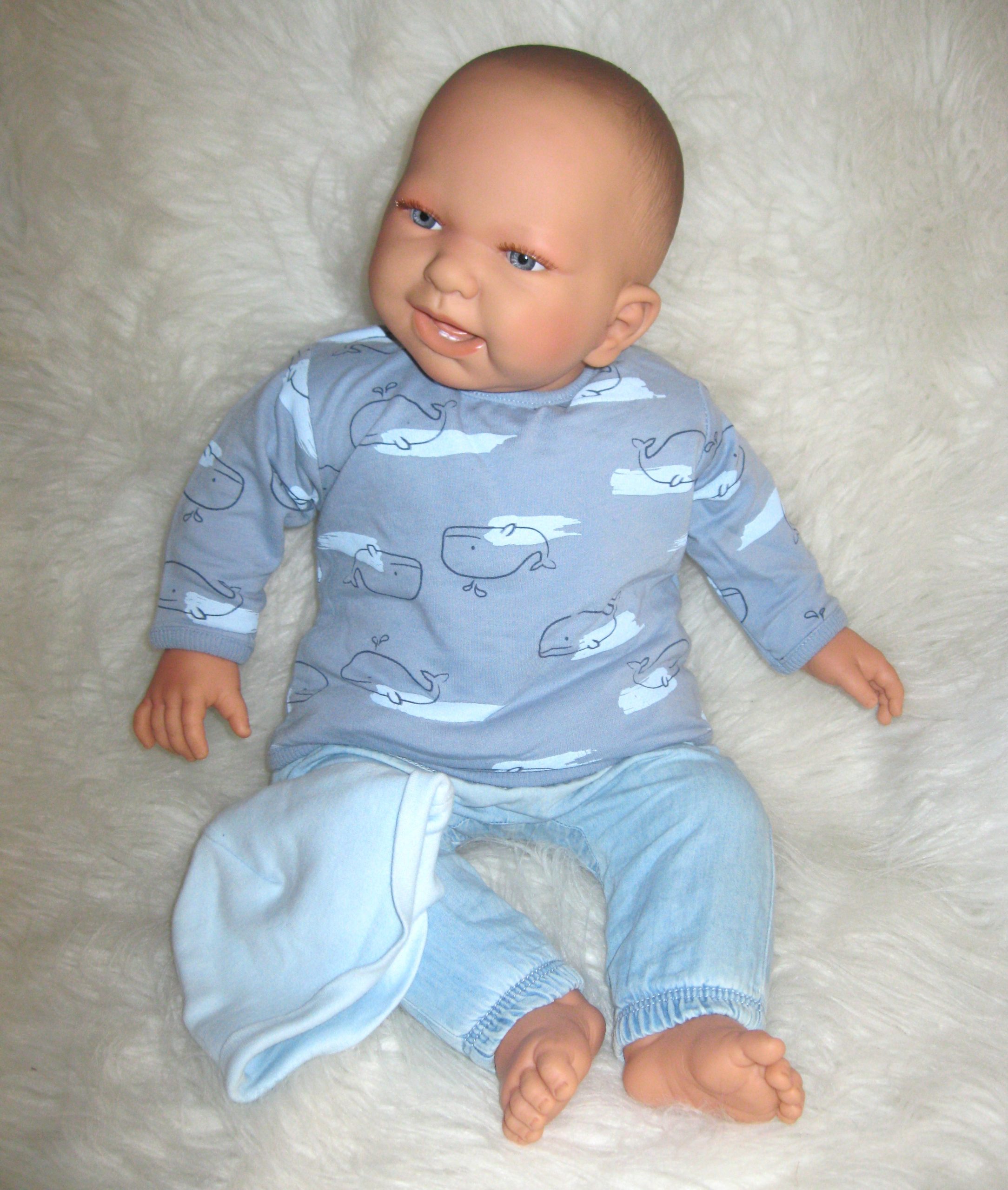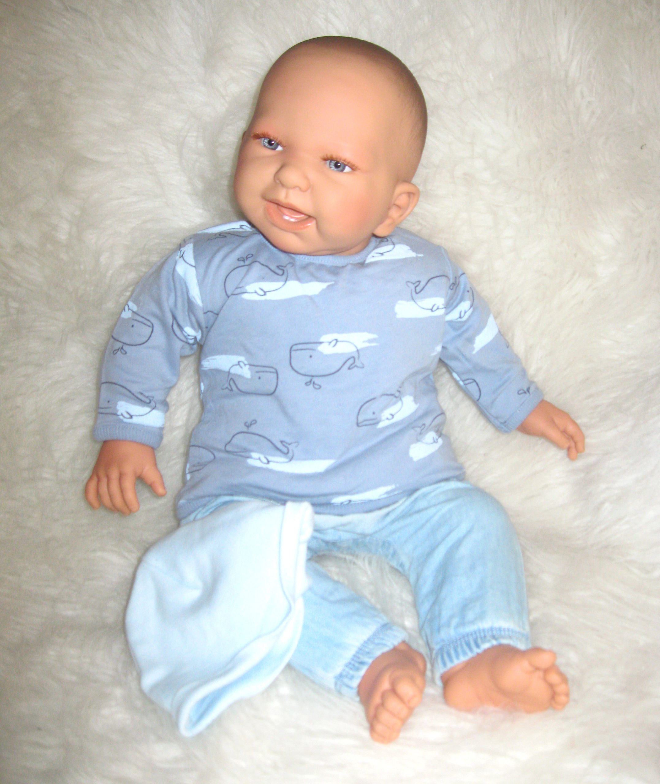 Levensechte babypop grote maat van het exclusieve merk Doro Dolls by Berenguer maat 53 cm. Het lijfje is van stof, de armen benen en hoofdje zijn gemaakt van vinyl. Deze pop kan zitten met steun in de rug. De pop heeft een mooi getailleerd gezichtje met vrolijke uitdrukking en blauwe ogen met wimpertjes. Maat 53 cm. De babypop past gewone babykleding klein maatje 50/56. Hij wordt geleverd met leuke kleding. Deze pop is ook zeer geschikt voor ouderen met dementie en als show pop voor babykleding of bijvoorbeeld als oefenpop voor cursus babymassage. Is niet geschikt voor kleine kinderen onder de 3 jaar vanwege de wimpertjes.