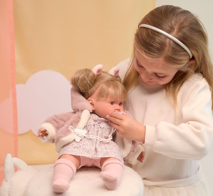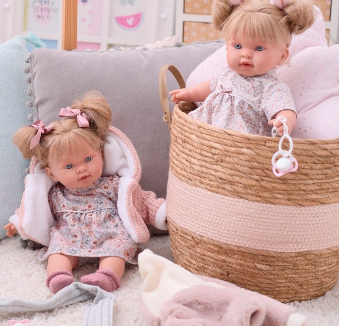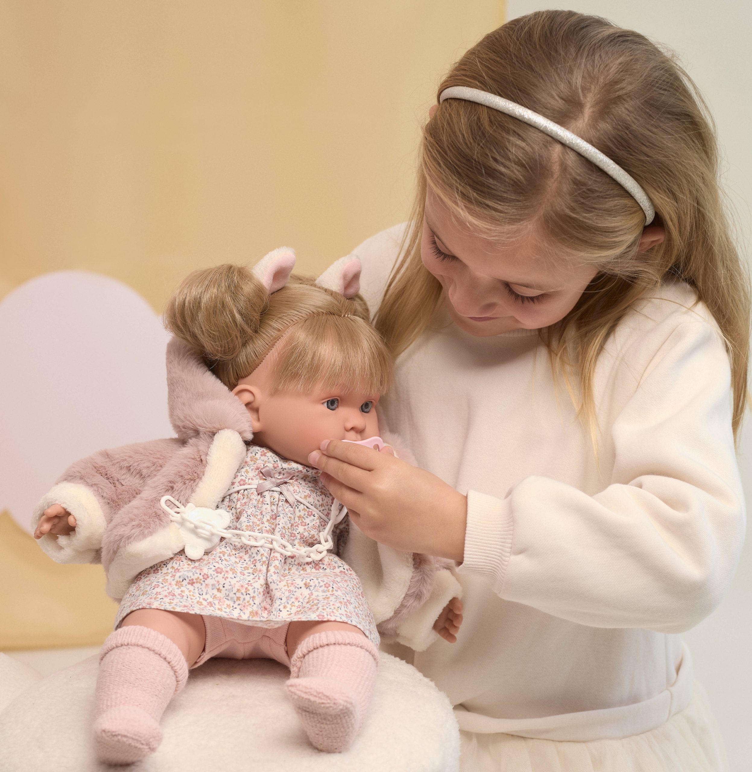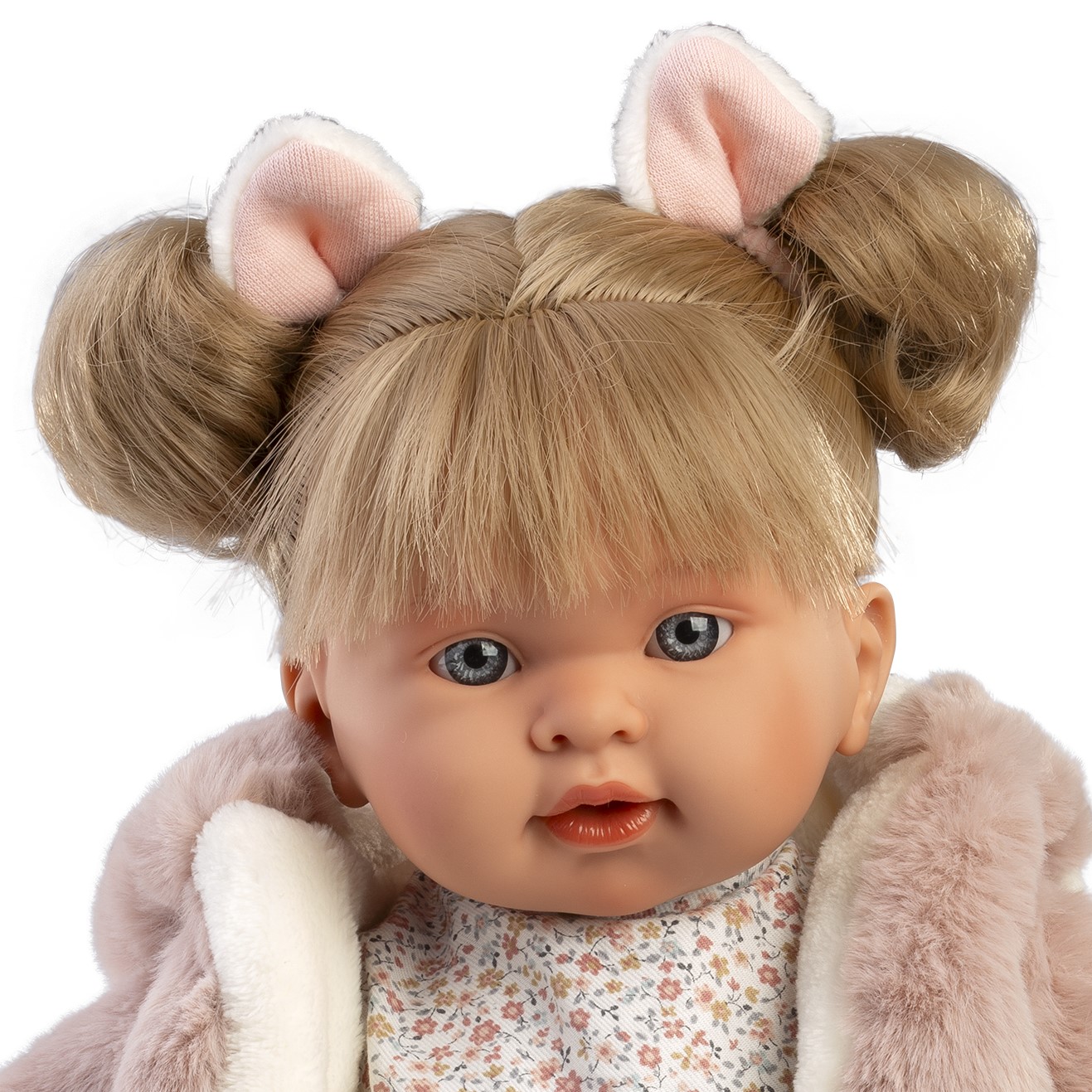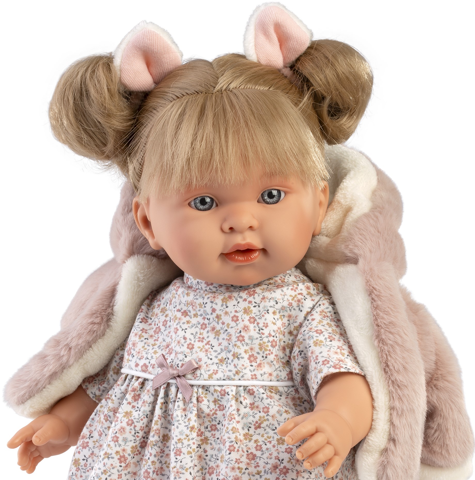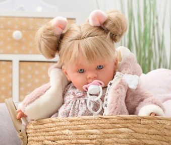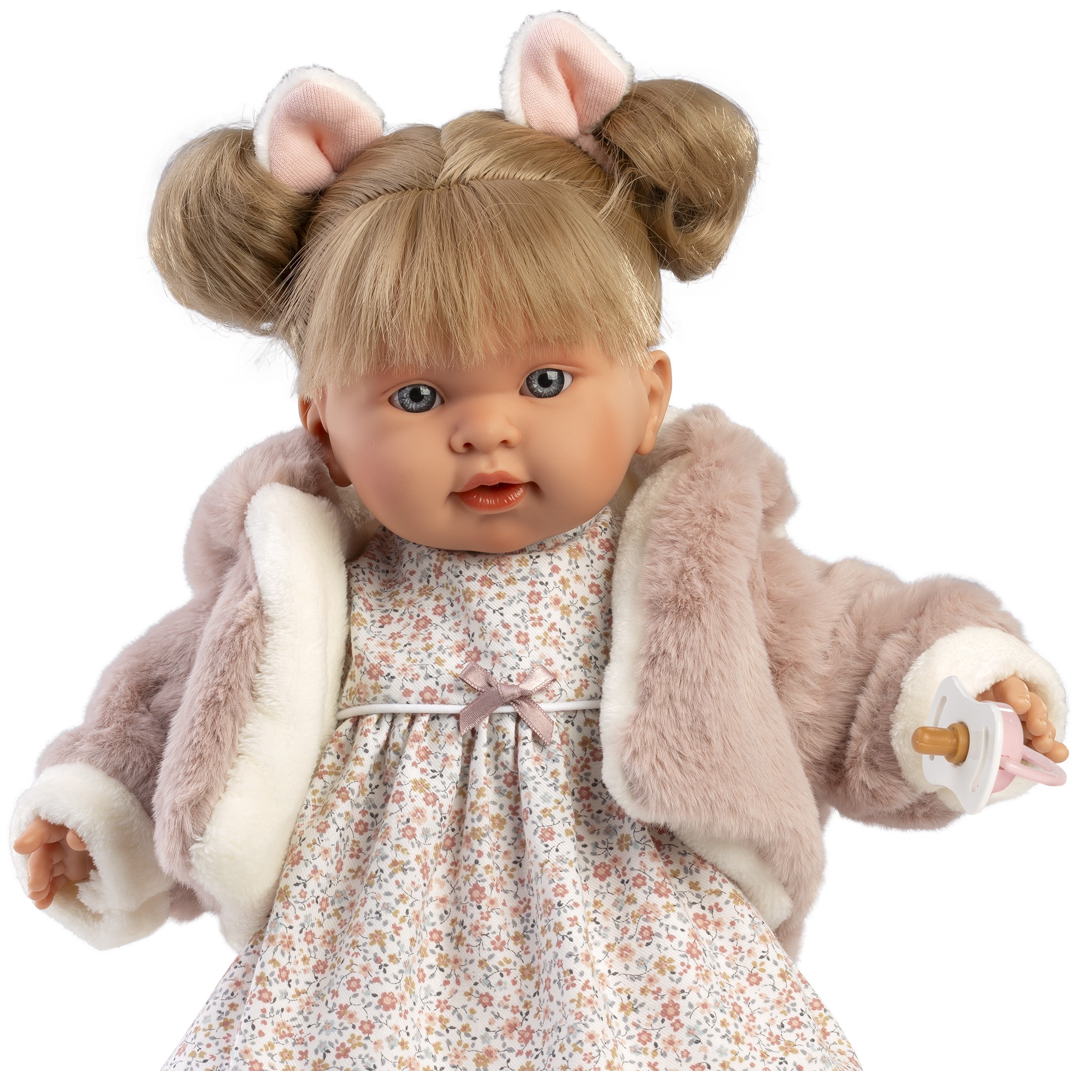 Mooie pop soft body met blond haar van het exclusieve merk Llorens 42 cm. Het lijf is van stof, de armen, benen en hoofdje zijn van vinyl. Deze babypop heeft een klein geluidsmechanisme in de het buikje. Het geluid wordt geactiveerd met het speentje. De pop gaat huilen en zegt mama en papa. Het geluid stopt als de pop het speentje in de mond krijgt. Als het speentje niet in het mondje zit stopt het geluid na 3 x vanzelf. Zij heeft sprekende blauwe ogen. Het gewicht van deze babypop is ca 600 gram. Inclusief kleding en speen. Passende kleertjes zijn in de afdeling poppenkleding. Een extra speen is te bestellen via email. Verpakt in een mooie doos.